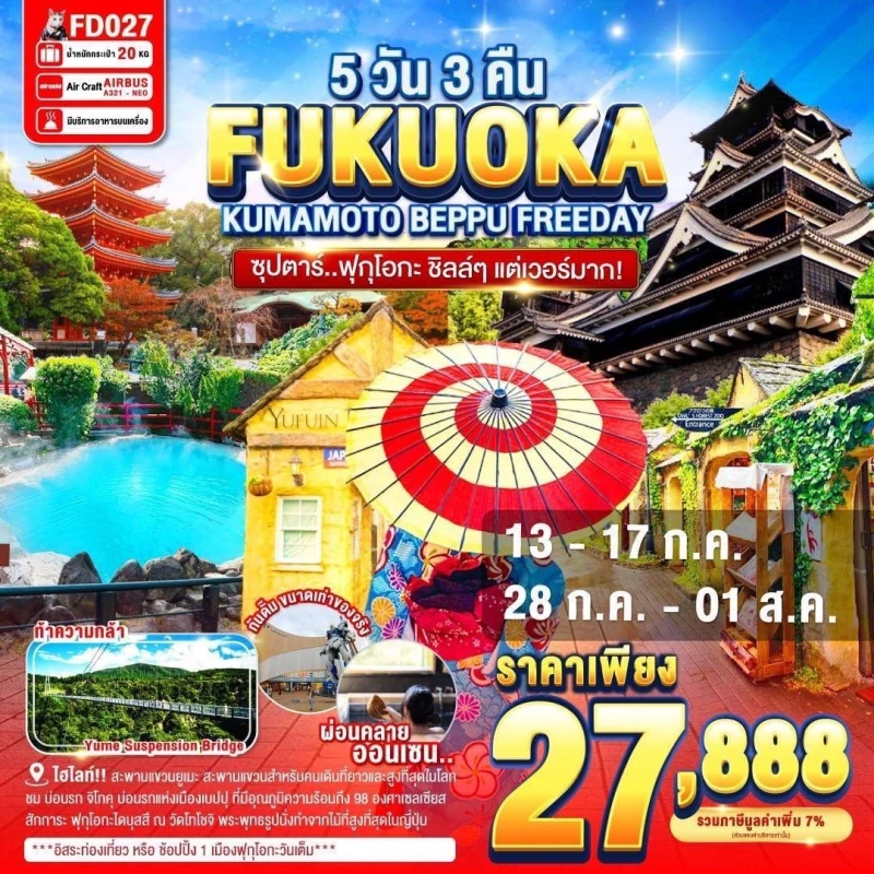- (จากภาพประกอบและชื่อทัวร์) อาจรวมการเยี่ยมชม หมู่บ้านยูฟุอิน (Yufuin Village) และบริเวณ ปราสาทคุมาโมโตะ (Kumamoto Castle) ในเส้นทาง